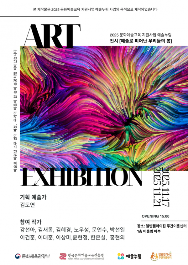 2025년 문화예술교육지원사업 예술누림 '예술로핌' 작품전시 페이지 정보 작성자 윤수정 작성일25-11-11 00:00 조회3회 댓글0건 본문 2025 문화예술교육지원사업 예술누림 '예술로핌' 작품 전시회가 진행됩니다. 많은 관람과 응원부탁드립니다. ○ 사업명: 2025 문화예술교육지원사업 예술누림 '예술로핌' ○ 전시기간: 2025. 11. 17(월)~2025.11. 21(월)○ 전시장소: 헬렌케럴의집 주간이용센터 다음글 목록